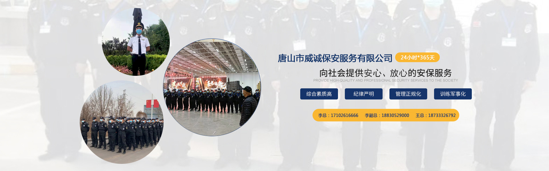 唐山市威誠保安服務有限公司自成立以來以“嚴防死守、忠于業(yè)主”為服務原則,以“客戶滿意、 合作共贏”為根本目標。以科學的管理、多方位多層次的服務,建立了首問責任制,完善了走訪、回訪 、滿意度調查、末位淘汰的預警管理,不斷提高服務質量,提高業(yè)主滿意度,提高企業(yè)形象。秉承“誠 實守信,紀律嚴明,團結協(xié)作,致精致誠”的服務理念,為客戶提供高品質、多方位、專業(yè)化的保安服務。 本公司制定了嚴謹?shù)亩ㄏ蛘猩徢芭嘤枴⒖己虽浻谩徶信嘤枴⒊掷m(xù)培訓、末位淘汰制等一整套完善的管理體系。可以根據(jù)客戶的要求實地勘察評估,以量身定做的方式提供安保防范服務。
